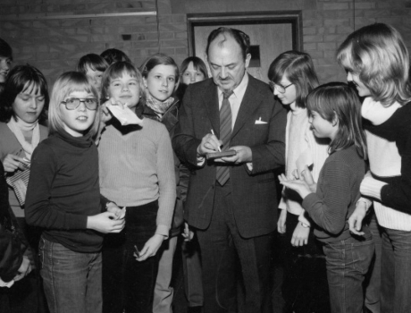Anker Jørgensen, der var statsminister fra 1975 til 1982, gæstede 25. april 1987 Galten. Her er han omgivet af elever på Gyvelhøjskolen. Anker Jørgensen skulle deltage i et stort fem-kantet møde mellem ledende politikere, men da det kom til stykket var det kun Anker Jørgensen og Venstres Anders Fogh Rasmussen, der ville bruge en forårsdag i Galten.