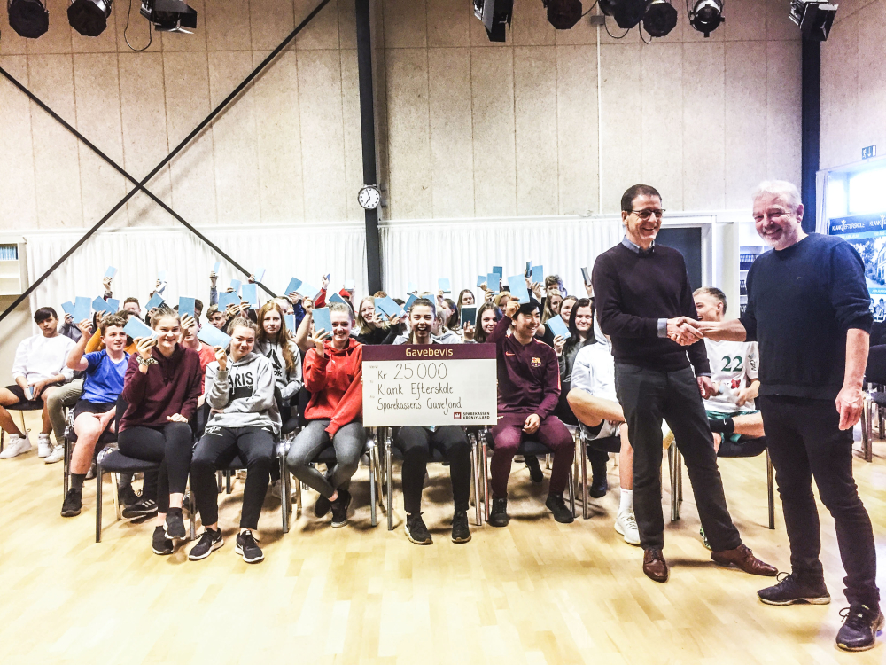 »Klank Efterskole har en lang historie bag sig, men har hele tiden formået at følge med tiden, så vi også i dag fremstår som en moderne efterskole med plads til traditioner. Når elever og lærere mødes til fællessang, styrker vi for eksempel fællesskabet på tværs af klassetrin. Det har Sparekassen Kronjylland i høj grad været med til at bidrage til ved at give os nye sangbøger, hvilket vi sætter meget stor pris på,« siger Klaus Larsen, forstander på Klank Efterskole.