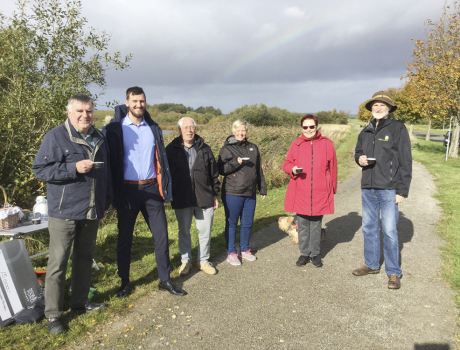 Overrækkelsen af donationer fra Nordeafonden og Lions Club Galten-Skovby fandt sted over en kop kaffe på stien ved Gammelmose i det vestlige Galten.
