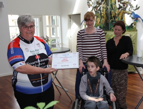 Kasserer for CVG, Dorthe Nielsen, overrækker den flotte donation, så Amira Bruun Lautrup (i kørestol) og de andre børn på Skovbo kan komme ud og cykle. Amiras mor, Maria Bruun Lautrup (i stribet bluse), og hendes veninde Maiken Pehrson, glæder sig over donationen.