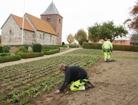 »Det er menighedsrådet som har valgt guldjordbær, fordi man gerne vil have et helt tæt bunddække. Guldjordbær-planterne vokser sammen så de bliver til et stort tæppe af gule blomster. Det kommer til at se godt ud,« siger Jørgen Eriksen, der ikke har set det benyttet andre steder i den mængde og samtidig ikke plantet så tæt.