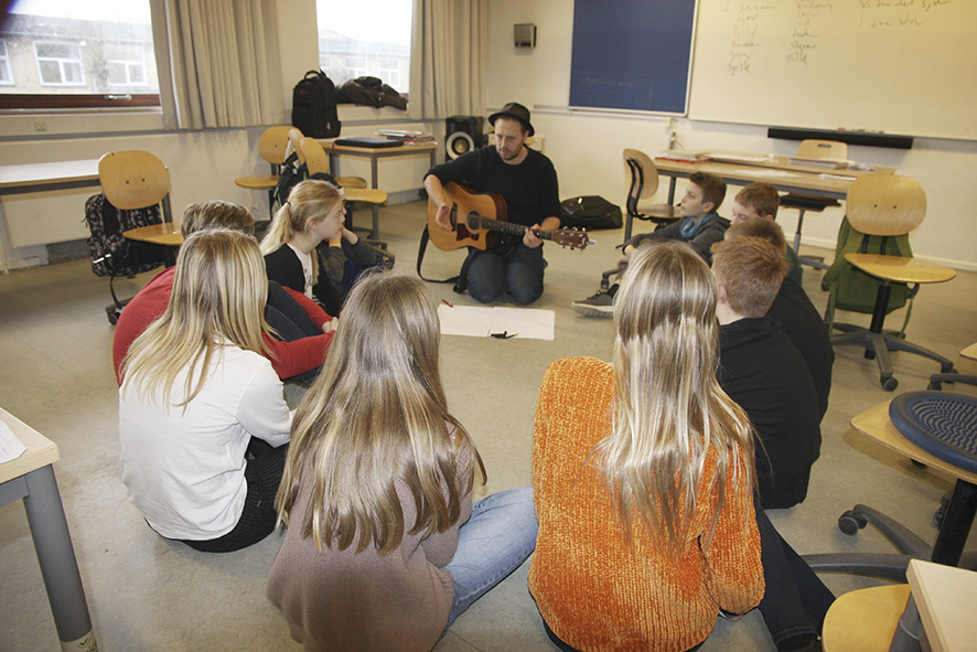 Da Folkebladet kiggede forbi om formiddagen havde elever og sangskriver taget plads i en rundkreds på gulvet for at brainstorme ideer til det der endte med at blive til sangen Vi sku ind og danse. Den anden gruppe skrev sangen Venner er bedre end fjender.