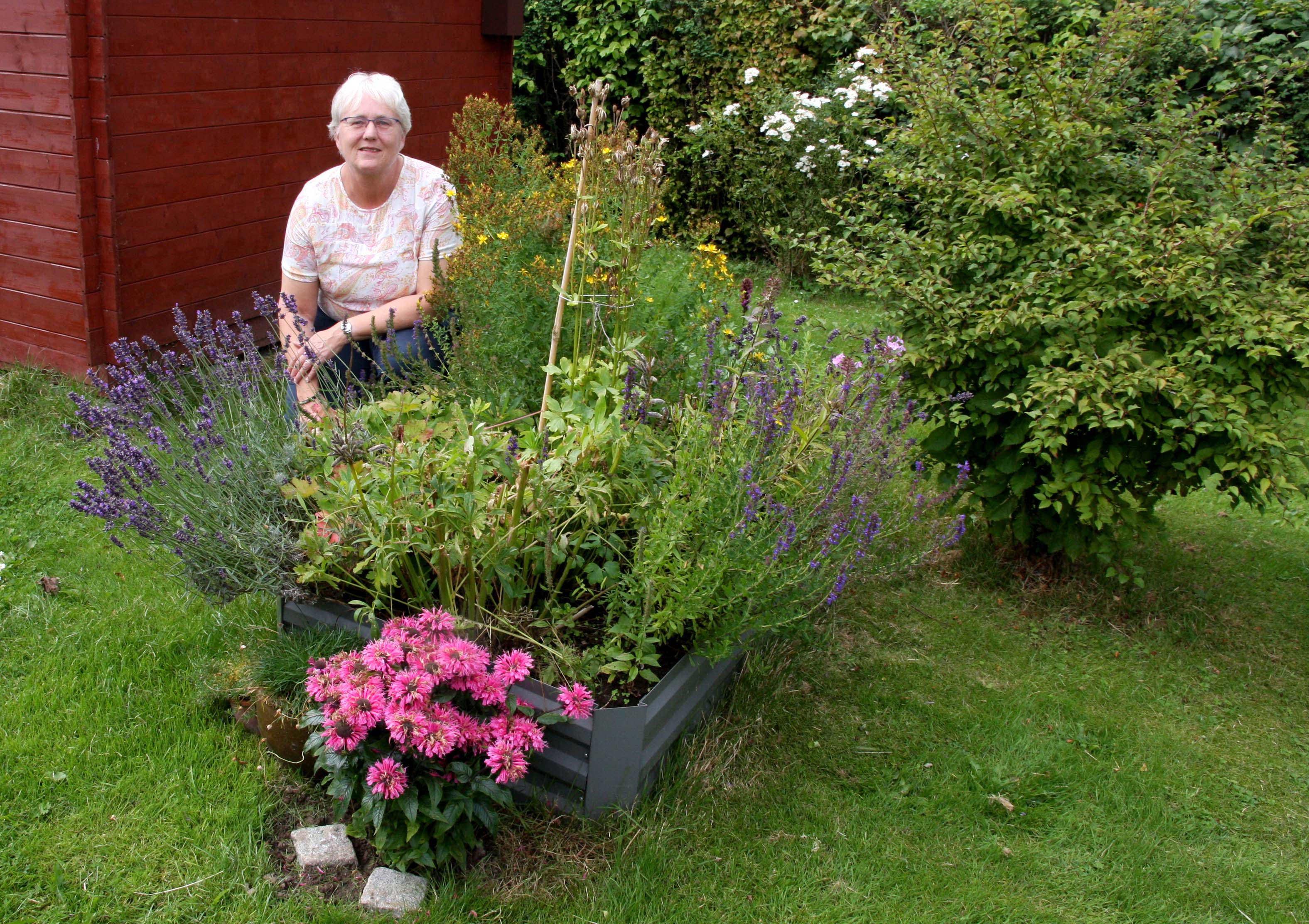 »Jeg har tænkt mig at udvide højbedet og er så småt i gang med overvejelserne. Det kan godt være, at jeg bygger nogle flere højbedsrammer op,« siger Alice Kristensen idet hun med en kenders mine strør om sig med navne på de forskellige plantetyper i højbedet.