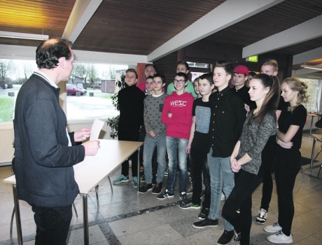 Samfundsfagslærer Martin Schaumann i færd med at instruere 9.x. forud for valghandlingen. »Lad nu være med at stemme på julemanden,« lød hans eneste formaning, der kunne komme i nærheden af at påvirke elevernes stemmeafgivning.