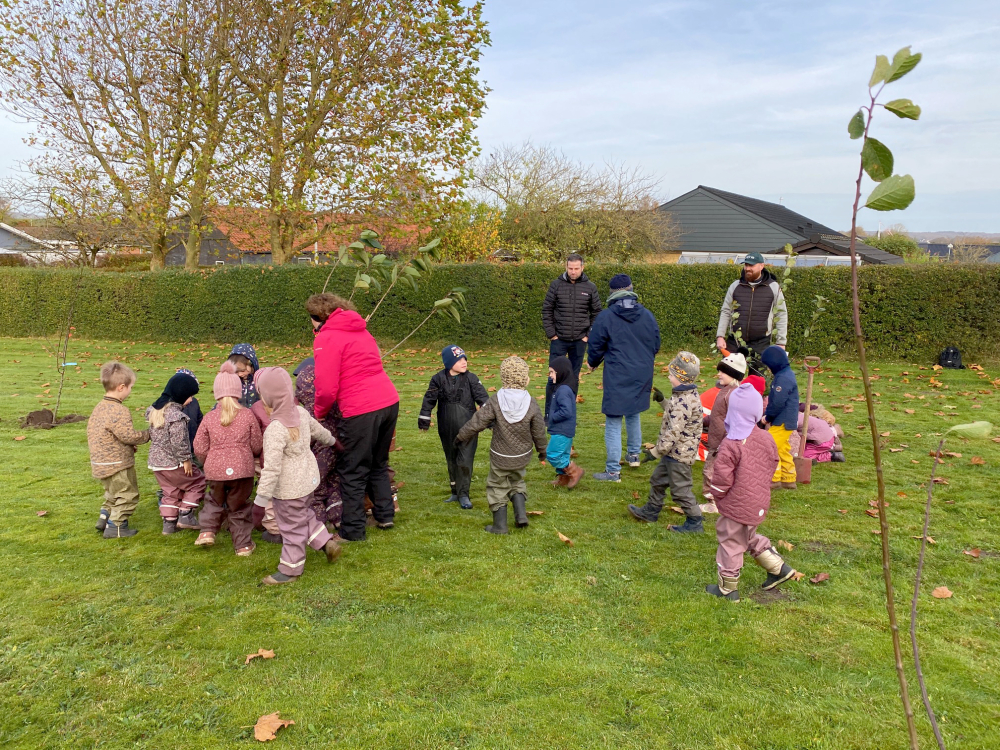 »Skanderborg Kommune havde to kyndige medarbejdere ude til at stå for plantningen. De havde styr på at få gravet hullerne og fik god hjælp fra børnehavebørnene til at lægge jord på igen,« fortæller Martin Frank Nielsen og tilføjer: