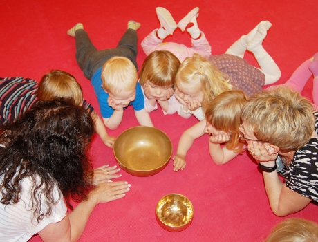 På et rødt skumunderlag ligger seks børn mellem to og fire år og lytter opmærksomt til lyden fra indiske syngeskåle, mens de mærker, hvordan lydbølgerne snurrer i underlaget og breder sig i kroppen.