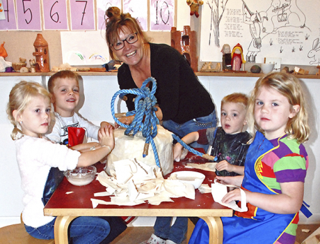 Fire af de kreative børn og pædagog Sonja Thomsen fra Galten Børnehave er her i gang med at bygge de kæmpeedderkopper, der skal sidde i det spindelvæv, som Jutlander Banks facade pakkes ind i fredag den 27. oktober.