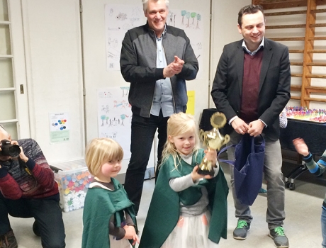 Claus Leick, formand for Skanderborg Kommunes Miljø- og Planudvalg, har overrakt pokalen til stolte børn i Børnehuset Bakketoppen i Galten