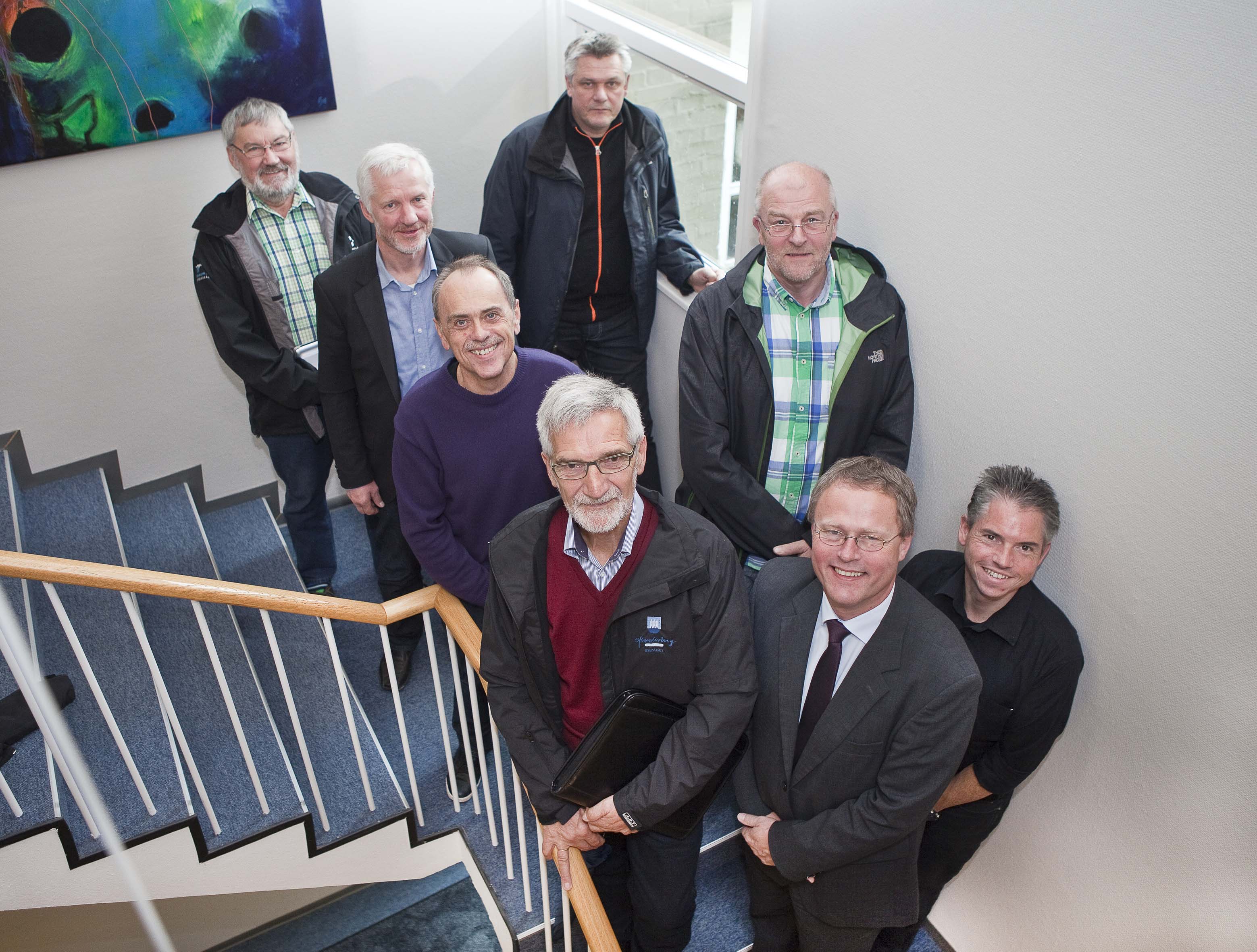 Glade og stolte politikere efter indgåelse af budgetforlig i Skanderborg Kommune. Nederst på trappen: Borgmester Jørgen Gaarde (A), Martin Skjødt Poulsen (O), Kristian Skovhus (A), økonomistabschef Jørn Prætorius, Tage Nielsen (B), Søren Erik N. Pedersen (V), Claus Leick (F) og bagerst til venstre Anders Christensen (V). Foto: Ole Nissen