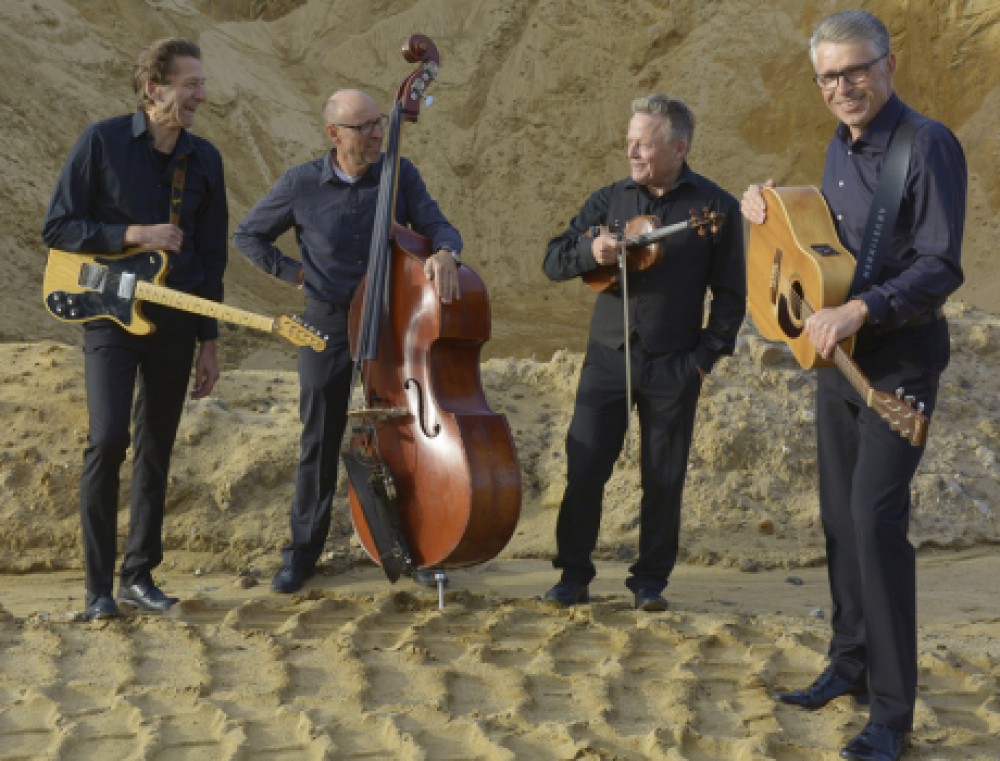 Karsten Holm (t.h.) sammen med Cohen Trioen: Martin Blom (diverse guitarer og kor), Bjørn Bønne Petersen