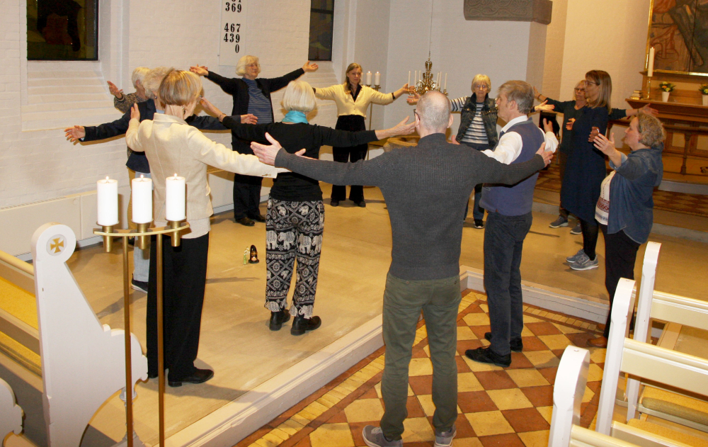 Sakral dans er koreograferede trin, der danses med en intention om en form for meditation i bevægelse. Sognepræst Hanne-Lise Mandrup var blandt deltagerne i dansen.