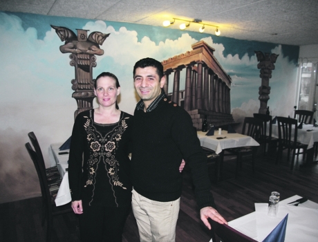 Et maleri af bl.a. Akropolis pryder væggen i den netop tilføjede afdeling hos Den Græske Taverna. På billedet ses restauratørparret Louise Madsen og Morteza Javaherian.