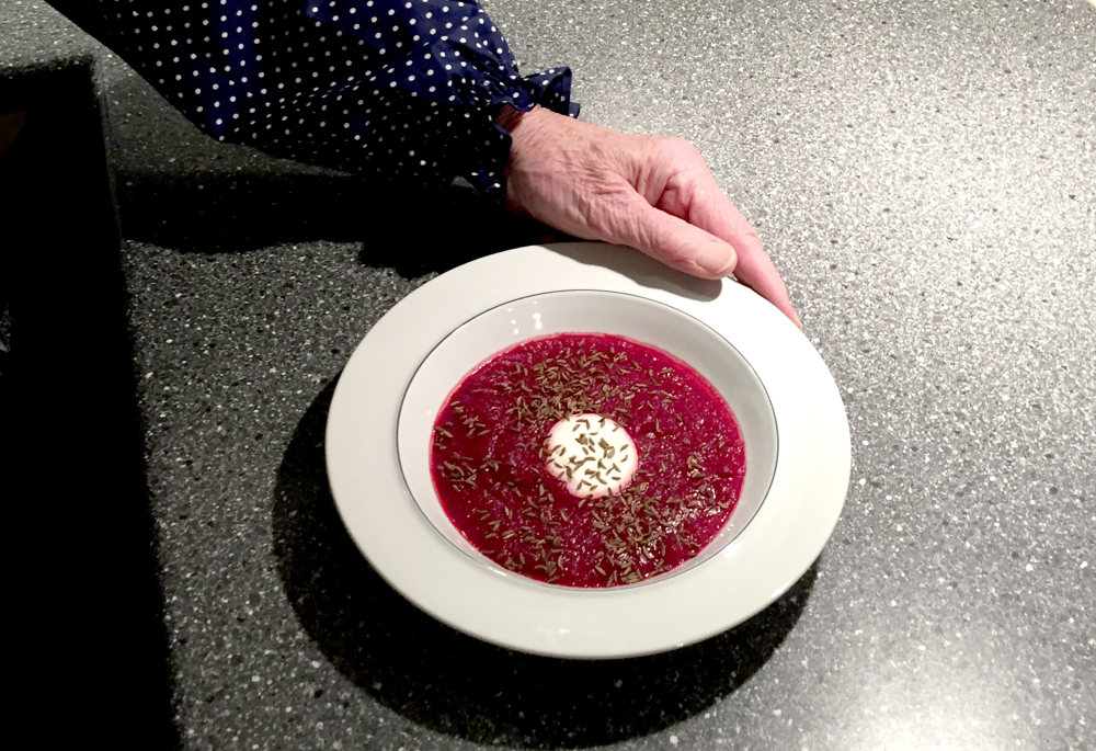 Jeg har valgt at give opskriften på rødbedesuppe. Den smager så godt og kraftig, den er flot og farvestrålende!