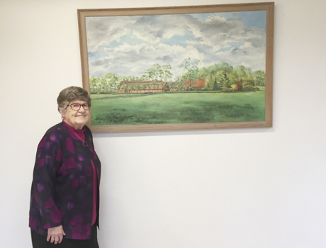 Else Johnsen ved siden af det maleri af barndomshjemmet som hun har skænket.