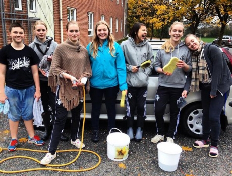 Bilvask til fordel for Knæk Cancer var denne elevgruppes indsats for at skaffe indtægter. Gennem fem timer vaskede de biler for 50 kroner.