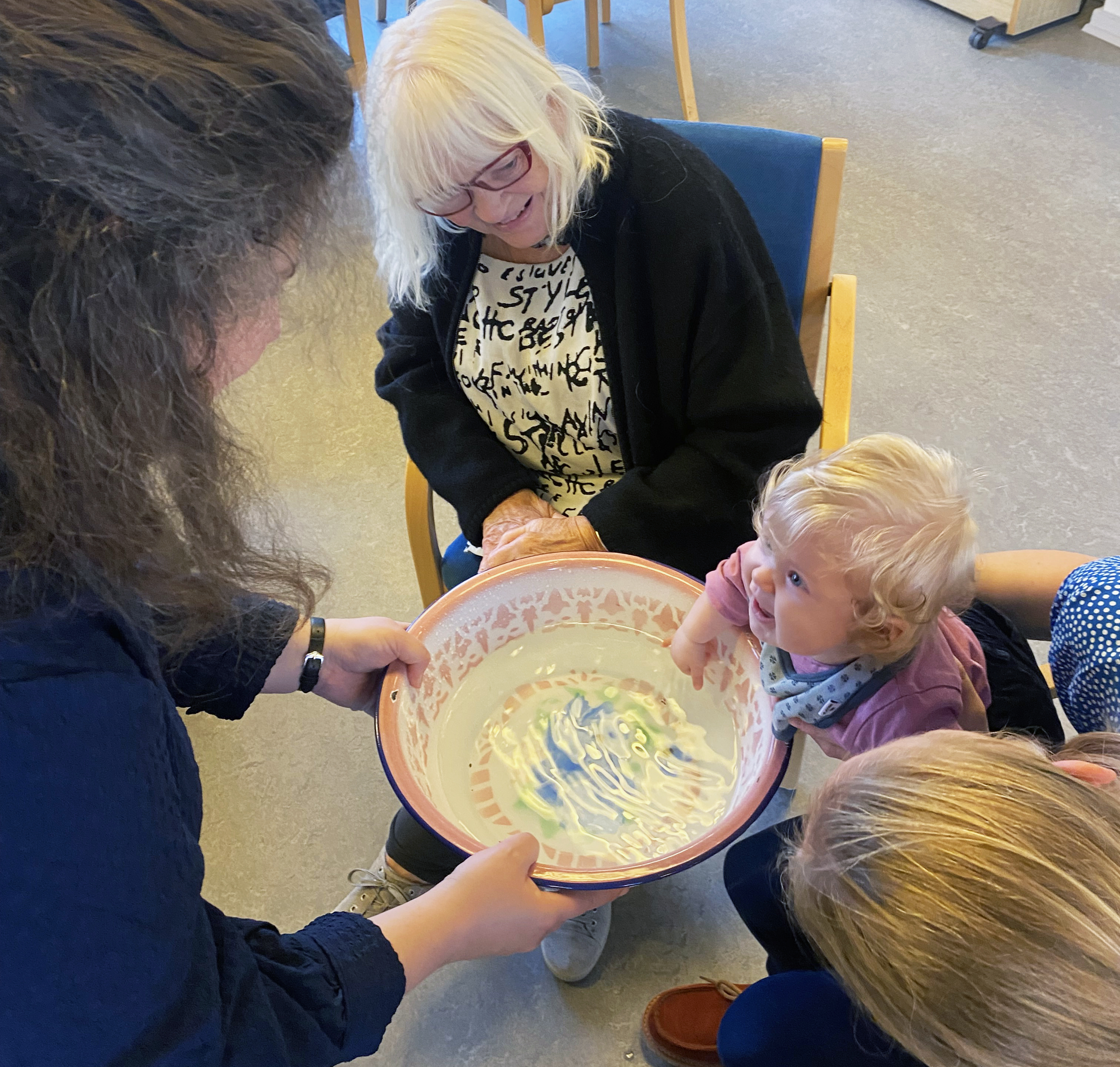 Der blev plasket i vand, grinet af og til hinanden, sunget med på salmer, holdt i hånd, leget med tørklæder, klappet efter sæbebobler, sludret om børn, børnebørn og oldebørn, spist mariekiks og smilet en masse.