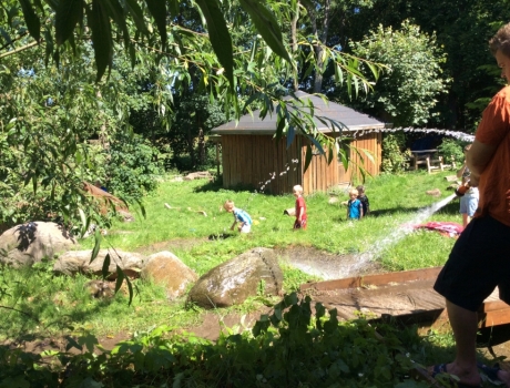 »De voksne sætter aktiviteter og lege igang, og på trods af det våde og kølige sommervejr, myldrer alle udenfor på det store dejlige udeområde som byder på mulighed for leg i naturen.«