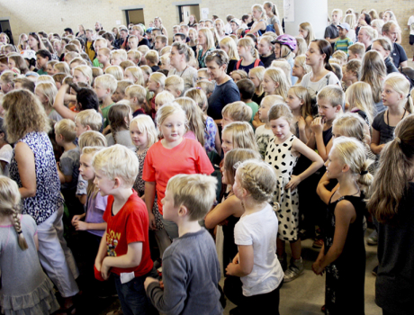 Efter at have tysset et par gange fik Gunnar Friedrichsen, pædagogisk leder på skolen, ro i salen, hvorefter Trine Dyrmose Kristensen på klaver og Jesper Carlo Larsen på guitar slog tonen an, og hele salen stemte i på sangen 'Ferie, ferie, ferie' - en sang som formodentlig blev sunget på de fleste af landets skoler.