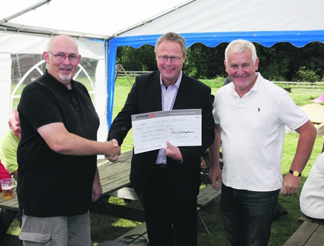 Høver Beboerforenings formand, Peter Nordheim (t.h.) og kasserer Mogens Kjærskov overrækker borgmester Jørgen Gaarde det sidste afdrag på det kommunale lån foreningen blev bevilget for 15 år siden i forbindelse med etableringen af Høver Beboerhus.