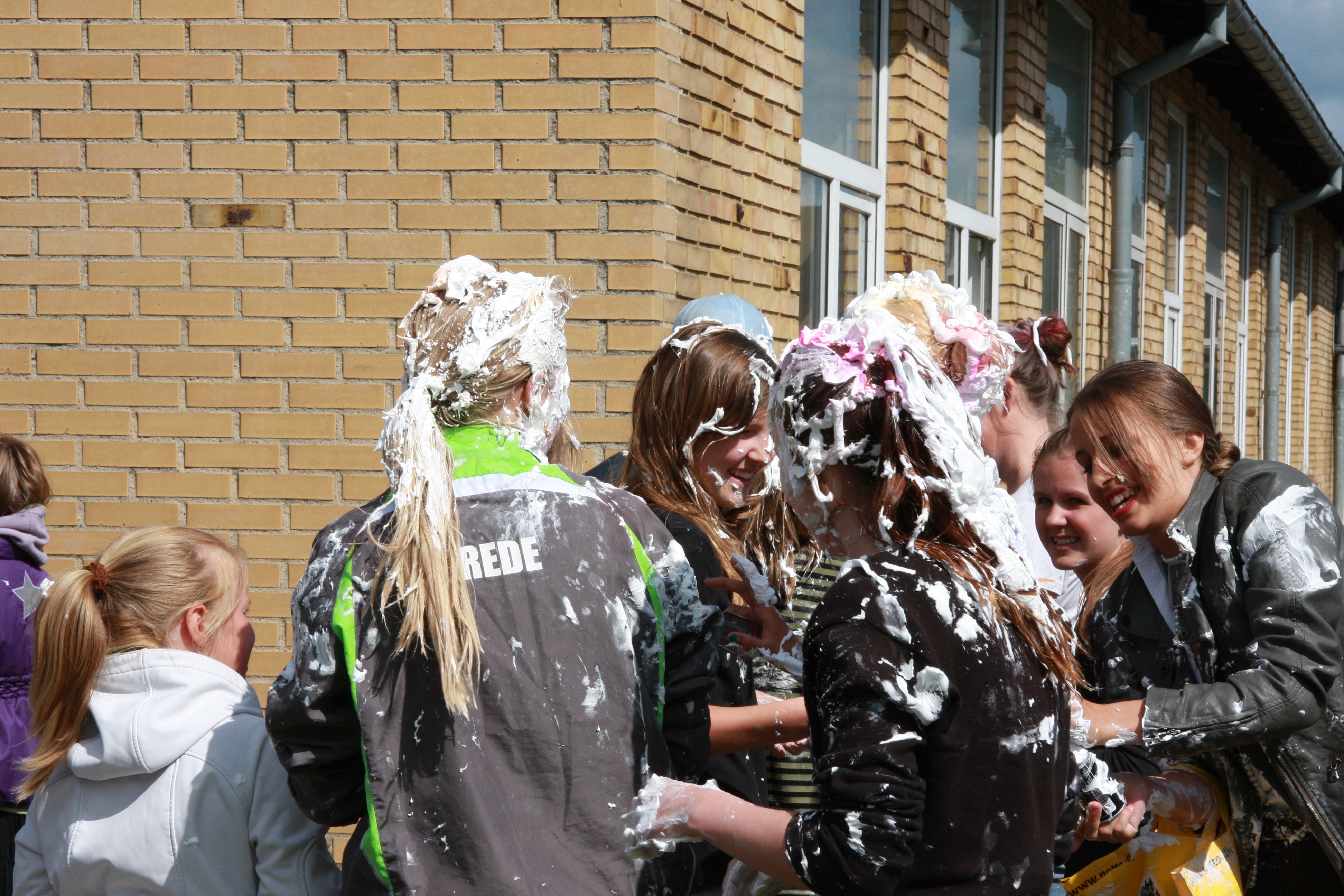- Ligeledes i tråd med traditionene blev vi klappet ud af Gyvelhøjskolen af de andre elever, og vi kvitterede for venligheden med en omgang flødeskum.
