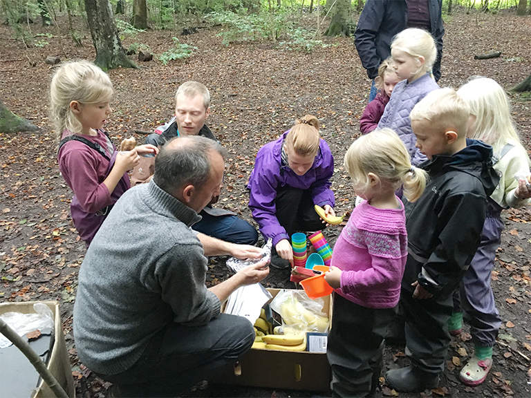 Familierne gik tur på FDF's grund i Smedeskoven, snittede snobrødspinde og lavede snobrød og stegte bananer over bål. Der blev også tid til sange, navnelege og leg i skoven og på den forhindringsbane, som nogle af de større FDF-ere er ved at bygge.