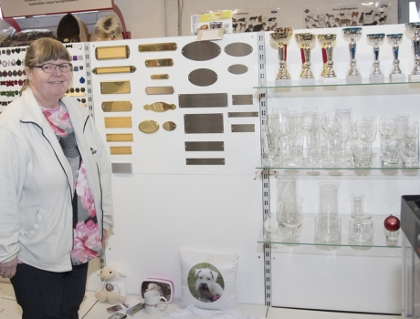 Kirsten Svalø ved et udvalg af sortimentet hos E-gravering.