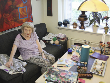 Stuen i boligen ved Tjørnehaven er fuld af malerier, fotos og strikkeprojekter. Reolerne bugner med figurer, mange af dem med eksotisk udseende, der vidner om et usædvanligt liv. I baggrunden kører fjernsynet, for sådan kan Sonja lide det. Soveværelset er fyldt til randen med håndarbejdsprojekter.