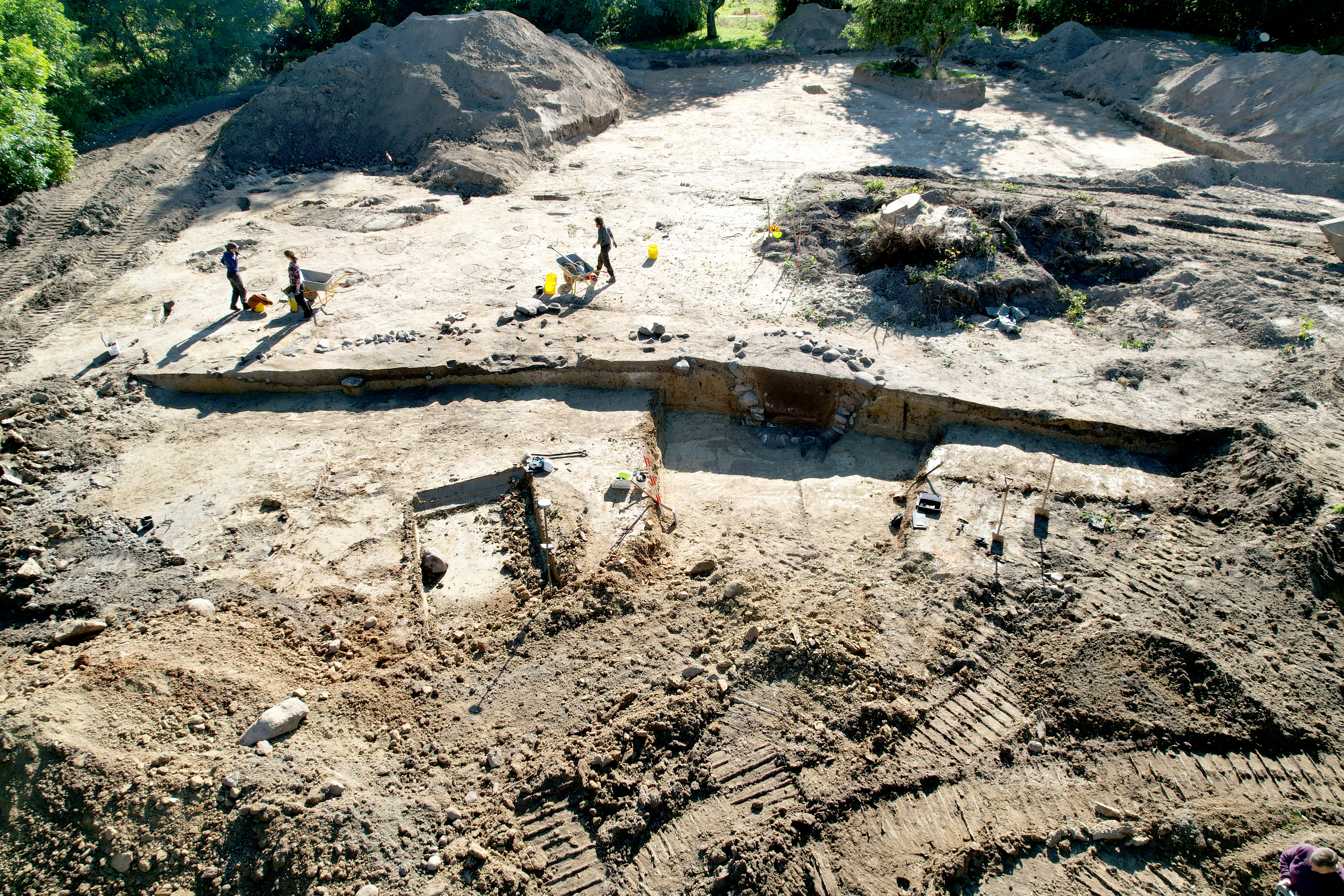 »Vi kan se er, at der under den tidligere gårdsplads findes en lavbundet sø – måske et gadekær. Den ses, som et stort rundt område med sort fyld. Der er masser af dyreknogler og forarbejdet træ heri, og hele vejen rundt har man lavet en form for indhegning, hvoraf vi nu blot ser rester af pæle i kanten af området,« forklarer Louise.