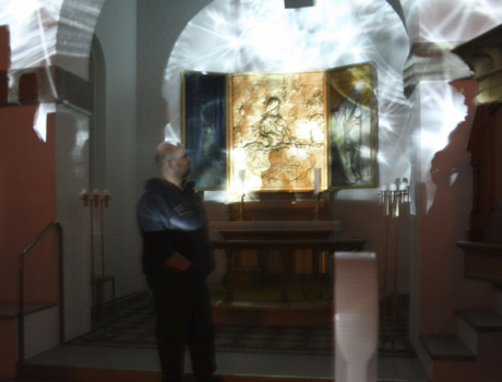 Tilsvarende ligner kirkerummet heller ikke sig selv, som det er henlagt i mørke. Den eneste lyskilde er en kraftig projekter, der fra indgangen oplyser hele den modsatte væg og altertavlen med "hypnotiserende" billeder.