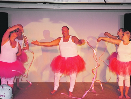 Et glimt fra sidste år Galten Revy med en del af revyholdet iklædt lyserøde tylskørter.