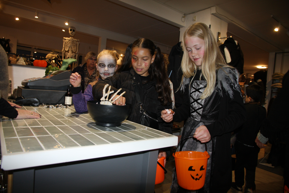Her blev der fejret halloween efter alle kunstens regler med masser af udklædte børn, drabelige monstre, skræmmende figurer – og masser af slik til børnene i byens butikker.