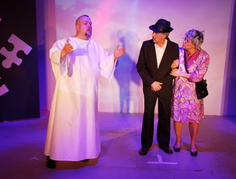 Vorherre (Thomas Schmidt) byder to pensionister (Jens Kr. Albrektsen og Tina Severinsen) velkommen i himmeriget.