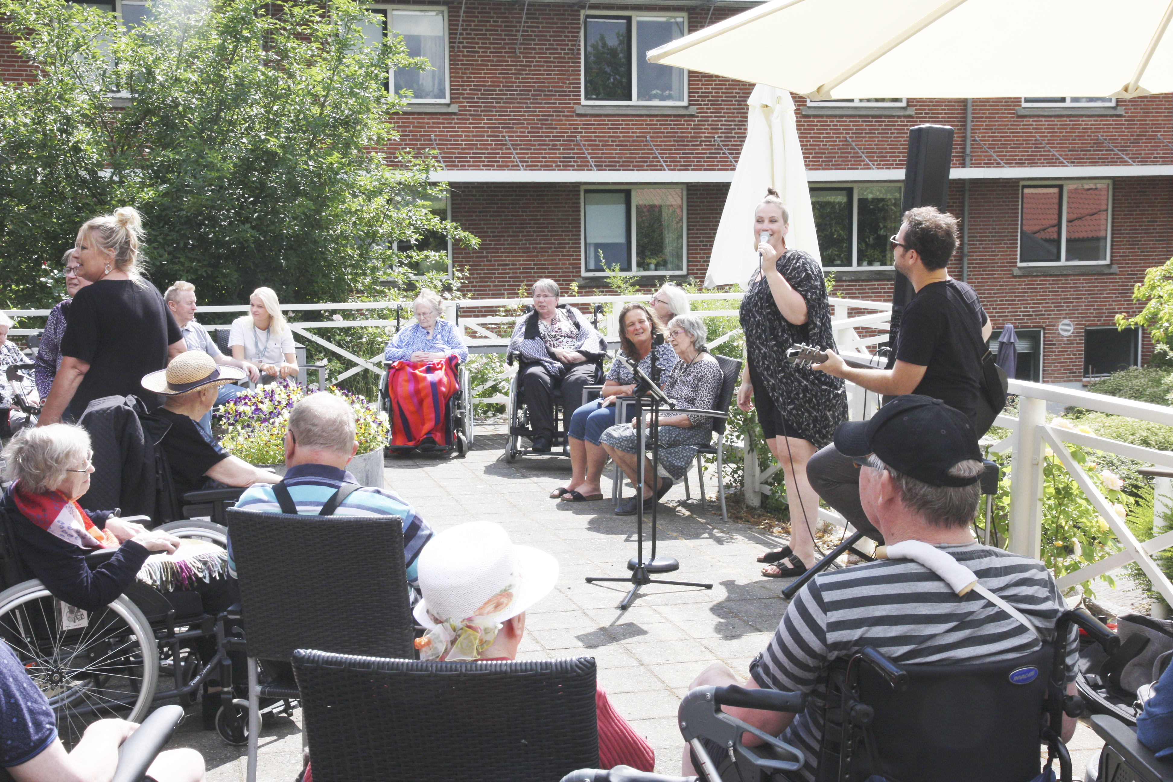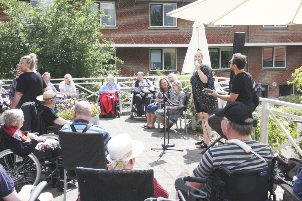Undervejs i koncerten blev fløjdørene slået op til cafeen, og flere beboere kom ud og nød sangene og musikkene mens nogle fik sig en lille svingom på terrassen med oplevelsesmedarbejder Anne Saabye eller en af Tjørnehavens plejere som dansepartner.