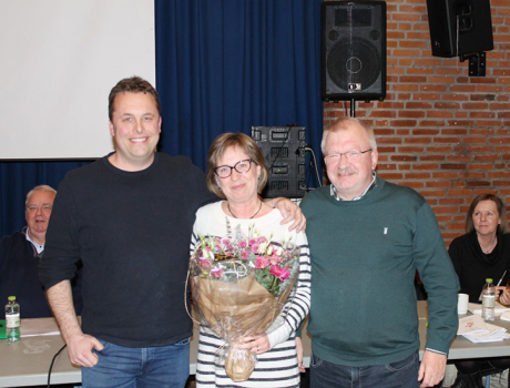 Lars Møller (t.v) konsulent hos JHF's kreds 5, overrakte Anette Thorsted håndboldforbundets æresnål i sølv for Anettes mangeårige indsats i Stjær Boldklub og håndboldens tjeneste. Til højre ses John Haarup Laursen fra Stjær BK.