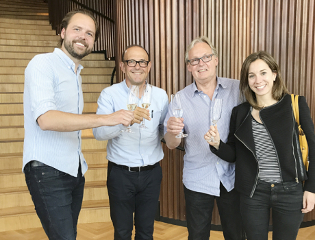 På billedet findes fra venstre: Direktør for Poly-Control Aps, Hans Overgaard, bestyrelsesformand for SALTO, Jose Antonio Itarte, stifter af Poly-Control Aps, Henning Overgaard og repræsentant for SALTO, Jaione Goñi. Billedet er taget efter underskrivelsen i Axel Towers i København hos SALTO's danske advokater, Gorrissen Federspiel.