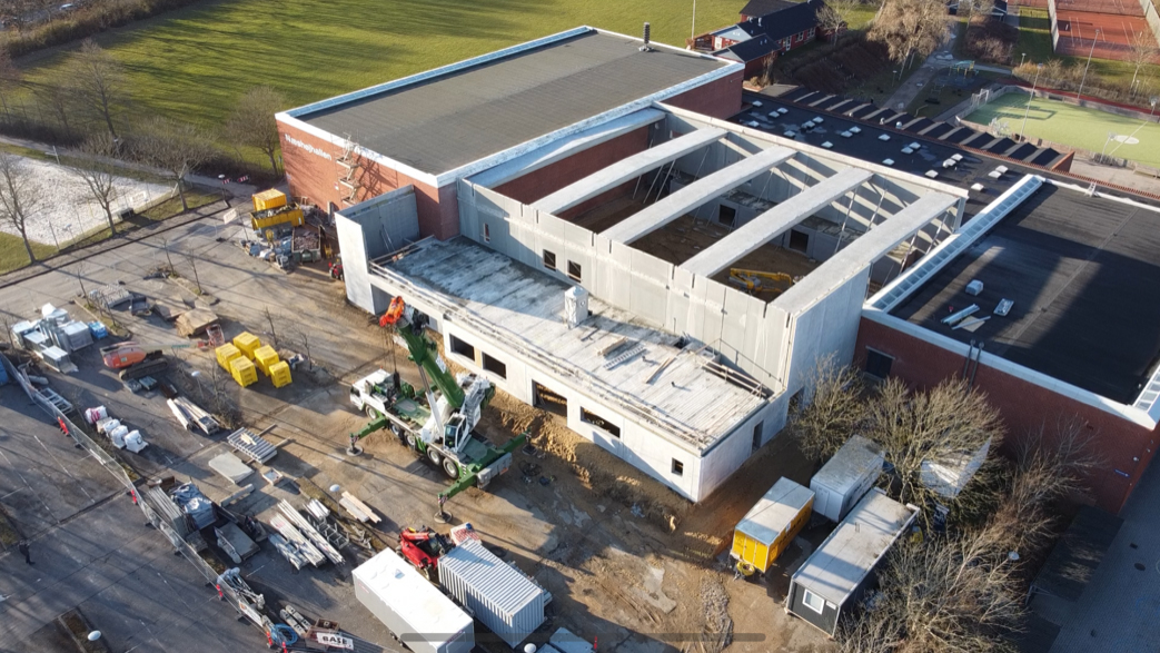 Det går planmæssigt med byggeriet, som har været begunstiget med udmærket vejr. At skolen har stået ubrugt i en længere periode pga. corona har, isoleret set, ligeledes været ”gunstigt”, idet trafikken til og fra skole har været væsentligt reduceret, samtidig med at sammenbygning med skolen og etablering af nye nødudgange i eksisterende hal og svømmehal har været enklere at koordinere.