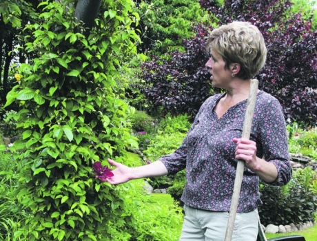 Tina Dahl Kastbjergs have er fuld af farver. Her ses en klematis - kravleranke - som er én af Tina Dahl Kastbjergs store favoritter, og som findes i alle regnbuens farver i hendes 800 kvadratmeter store have.