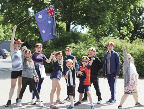 Det entusiastiske australske hold er klar til kamp. Fra venstre: Hanna fra 6. kl., Zenia, 2. kl, Anne, 7. kl., Rebekka, 1. kl., Johan, 4. kl, Gustav, 0. kl., Oliver, 0. kl., Gustav, 4. kl., Rasmus, 5. kl. og Frida, 3. klasse.