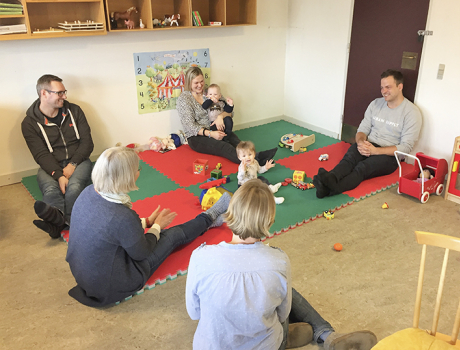 Den 1. februar startede vuggestuen i Herskind med de to første børn som her er på besøg med deres forældre. I forgrunden med ryggen til ses de to nyansatte vuggestuepædagoger.