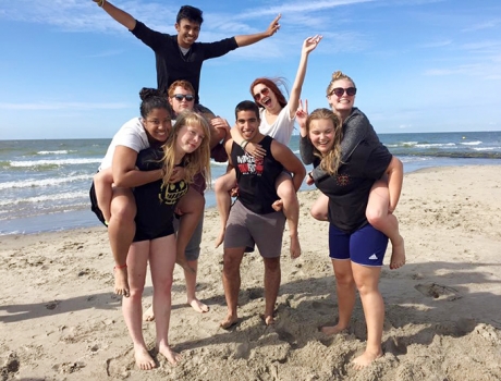 På campens sidste dagstur tilbragte de en hel dag ved stranden og prøvede at surfe, dog uden det store held. På billedet ses Bella og Winifer fra New York, Monica fra Finland, Liam fra Canada, Kanak fra Indien, Yuval fra Israel, Benedicte fra Norge sammen med Stine fra Skjørring.