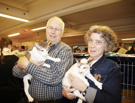 Mange af de katte, der kunne beundres på udstillingen, var udenbys, men der var også lokale kattefans. Her er det Galten Kiosks indehaver, Torben Christensen og fru Ytha som ses med 'Knold' og 'Tot' som er af henholdsvis Orientaler- og Siameser-racen. Det er 'Knold' som Ytha Christensen har i favnen.