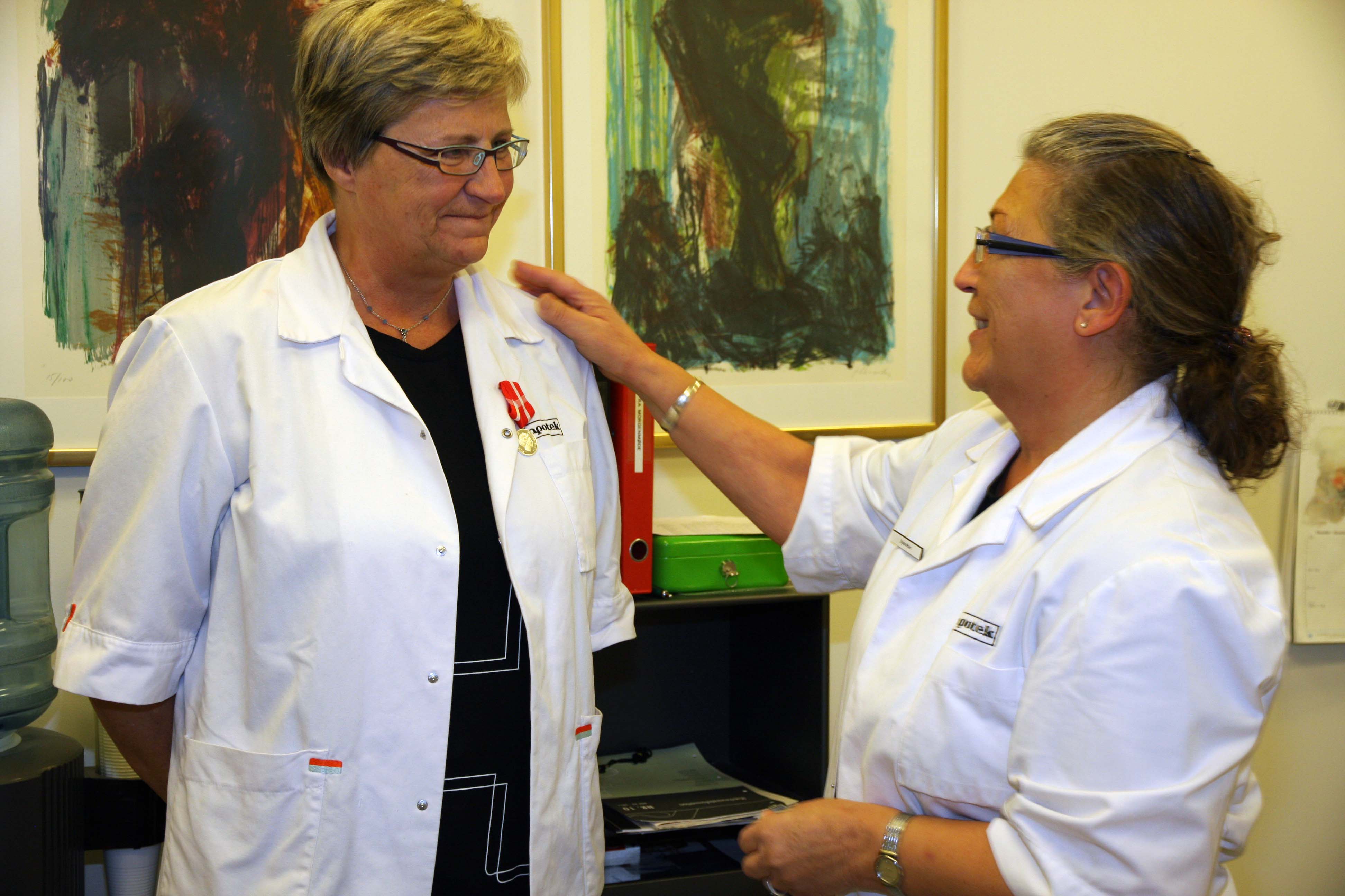 Rita Mathiesen til venstre får overrakt sin medalje af apoteker Inger Rasmussen, Galten Apotek.