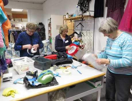 Tre af de frivillige, fra venstre Karen Nielsen, Jytte Nielsen og Anni Sørensen i gang med at sortere og sætte priser på varer i tøjafdelingen hos Kirkens Korshærs Genbrug i Galten. Her gælder det varer til fastelavnssalget.