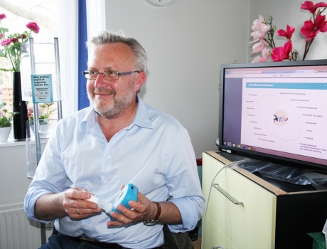 Lars Nørgaard, rygestopinstruktør sidder klar til at teste kursisterne, med sin kuliltemåler.