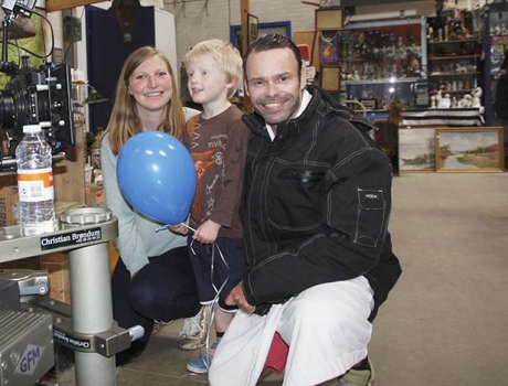 Femårige Vitus Preuss Griffel og hans mor, Lisbeth Preuss fra Årslev er blandt statisterne ved filmoptagelserne på Låsby Marked. Her ses de sammen med komiker og skuespiller Mick Øgendahl.