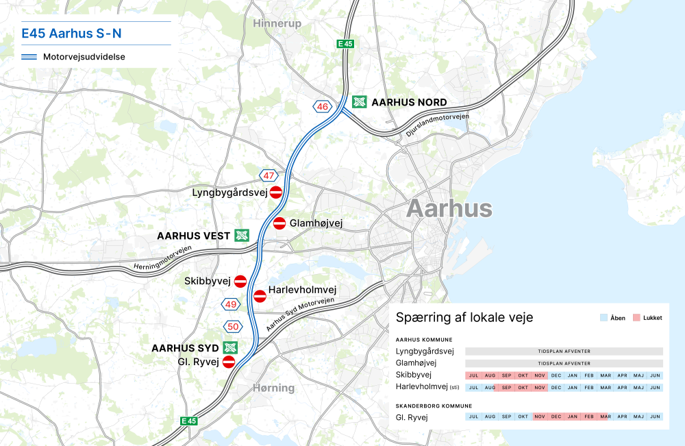 I takt med at E45 udvides omkring Århus, skal de tunneler, der fører de lokale veje under motorvejen, også forlænges. Få et overblik over hvilke veje, der er spærret hvornår.
