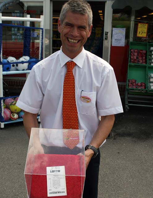 6-10-14-16-20-31-32. Sådan lød de syv lotto-vindertal, der udløste godt 18,2 mio kroner for en heldig beboer i Herskind-området, og som efterfølgende har resulteret i øget lotto-omsætning i butikken. Nyheden om årets hidtil største Lotto-gevinst på over 18,2 mio kroner vundet på en lynlotto ved forrige lørdags lotto-udtrækning gik landet rundt og skabte en mindre fest i Dagli'Brugsen i Herskind, hvor kuponen er solgt. - Min søndag blev lige pludseligt helt anderledes end forventet, og det blev mandag, tirsdag og onsdag også, fortæller brugsuddeler i Herskinds lokale brugs Michael Øulee, der søndag til onsdag i sidste uge var travlt optaget af at snakke med journalister og optrådte i diverse aviser, radio-programmer samt på TV2 Østjylland. - Det er jo en stor nyhed for sådan en lille butik som os. Vi kender rigtig mange af vores kunder, så vi håber, det er en af vores kunder, der har vundet, siger Michael, der sammen med resten af personalet ventede i spænding fra nyheden kom ud søndag morgen og frem til mandag aften, hvor vinderen meldte sig til Danske Spil. Mange gætterier - Det har været så sjovt at være på arbejde. Der er en totalt fed stemning her, helt euforisk. Alle folk der er kommet ind i butikken har vi jo spurgt; »Hva' så, har du vundet 18 mio kroner?«, smiler Michael, der dog ikke har fået nogen positiv tilkendegivelse på det spørgsmål. Og den anonyme vinder sætter gang i snakketøjet i den lille by. - Der har været mange rygter, først var det en mand, så var det en dame og så var det en familie med børn. Der er mange gætterier. Her i Herskind kan man godt være anonym, men ikke i ret lang tid. En kunde fortalte, at hun havde købt ny bil, bestilt før lotto-udtrækningen, men med levering efter. Og hun meddelte, at hun snart overvejede at opstille et skilt uden for matriklen, hvorpå der stod, at det ikke var hende, der havde vundet. Flere kunder Dagli'Brugsen i Herskind fejrede lotto-begivenheden med smørrebrød til personalet og flag i othellolagkagerne onsdag. Omsætningen bærer også præg af den øgede aktivitet, der har været i forretningen. - Vi har haft ti procent flere kunder inden for den seneste uge, så det har været lidt overvældende. Til trods for at vinderchancerne i Herskind næppe er øgede ovenpå den lokale lotto-gevinst er salget af lotto i butikken er steget med fire procent, ledsaget af en hel masse snak. - Der snakkes rigtig meget og det er alt lige fra vognmændene til kunderne og os selv. Først og fremmest er det jo en sjov og positiv begivenhed, siger Michael, der sammen med personale og kunder nu har et evigt minde om det heldige værtsskab i form af en indrammet lignende lottokupon liggende på en rød velourpude sendt fra Danske Spil. jlc Foto: Brugsuddeler i Herskind, Michael Øulee, er snart i træning med at smile til fotografen efter at han i den seneste uge har været belejret af talrige medier i anledning af den 18-dobbelte milliongevinst solgt i butikken.