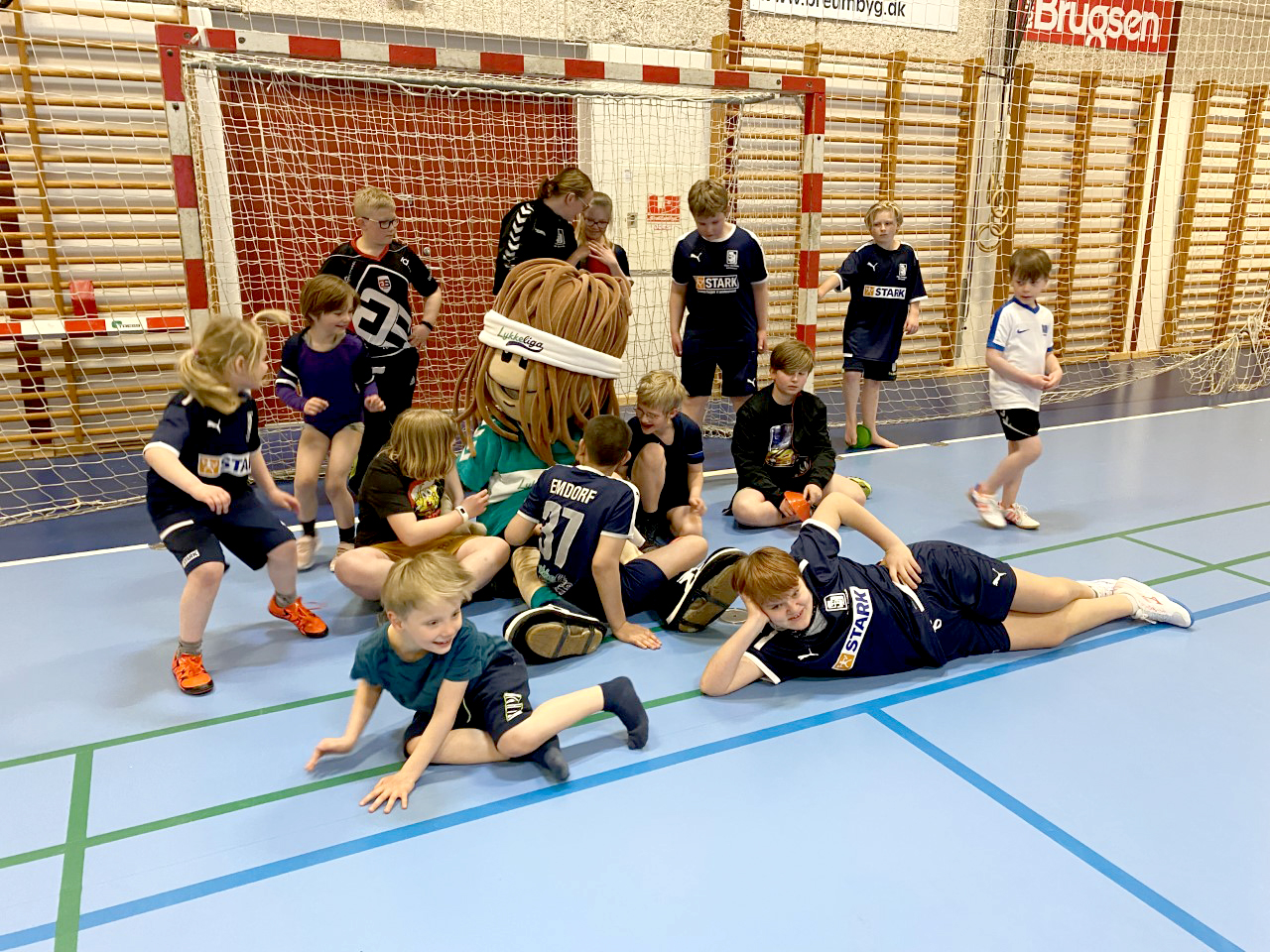 Lykkeliga maskotten Lars mødte forleden op i Stjærhallen, hvor det lokale lykkeliga-håndboldhold var samlet til træning. Besøget skabte stor glæde hos børnene.