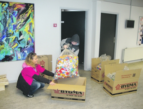 I fredags blev første sending af mælkelåg sendt af sted. Lene Haagh fra Skovbyskolens Venner var med til at sikre, at alle mælkelåg kom sikkert ned i kasserne og sendt af sted.