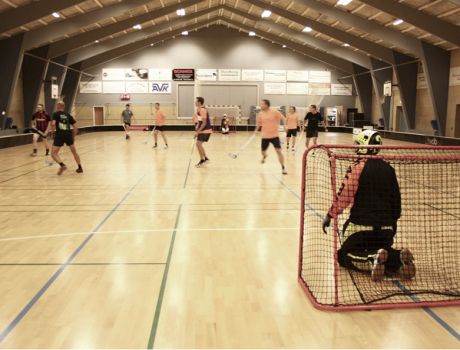 Det er torsdag og scenen er sat til floorball i Galten-hallen. Bemærk de særlige bander og de knælende målvogtere.